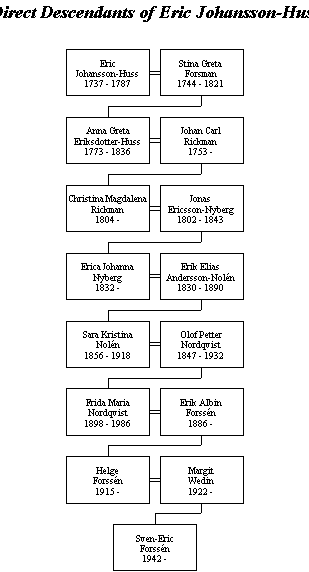 | Anna Ericsdotter Huss | Eric Olofsson-Huss f. 1669 Torp Kyrkoherde Berg (1713-1727) | Olof Ericsson-Huss f. 1634 Torp Kyrkoherde Torp (1669-1695) | Eric Nilsson-Huss f. 1590 Hässjö Kyrkoherde i Torp (1647-1670) | |